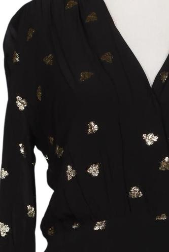 | Details | Chiffon, metallic, Langarm, Bindegürtel, Wickeloptik, V-Ausschnitt, Motivprint |