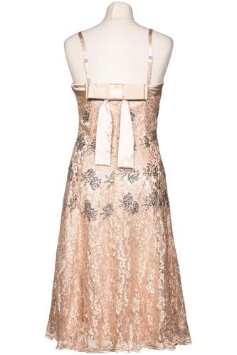 | Details | Satin, Pailletten, Spitze, ärmellos, V-Ausschnitt, Reißverschluss/Knöpfe hinten, Floral |