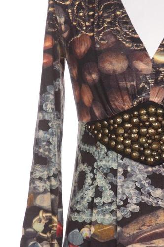 | Details | Jersey, metallic, Stollen, Dreiviertelarm, Bindegürtel, V-Ausschnitt, Motivprint |