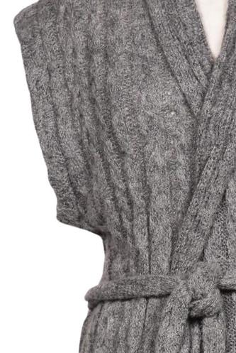 | Details | Grobstrick, ärmellos, Bindegürtel, Wickeloptik, verschlusslos, Einfarbig |