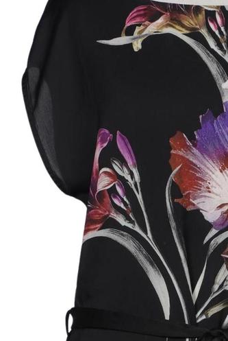 | Details | Satin, Kurzarm, Bindegürtel, Rundhals, Floral |
