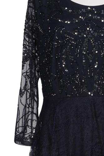 | Details | Pailletten, Tüll, Dreiviertelarm, V-Ausschnitt, Reißverschluss/Knöpfe hinten, Einfarbig |