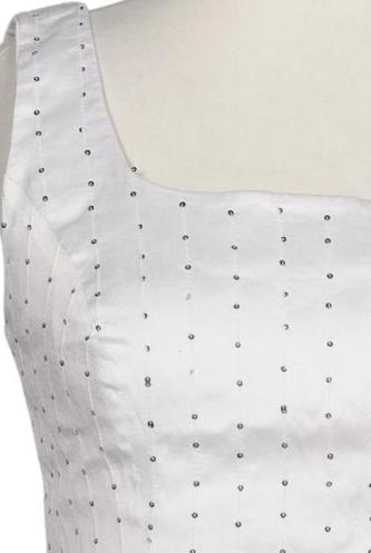 | Details | Satin, ärmellos, Rundhals, Reißverschluss/Knöpfe hinten, Punkte |
