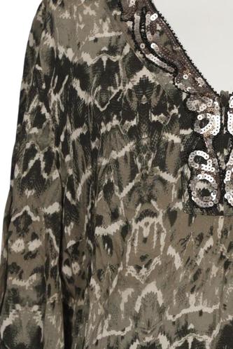 | Details | Stickerei, Dreiviertelarm, V-Ausschnitt, verschlusslos, Motivprint |