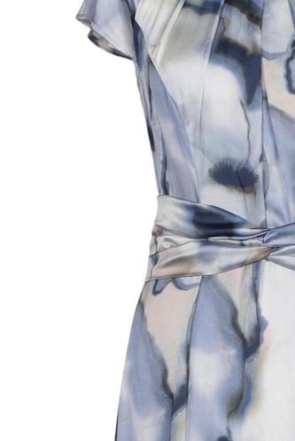 | Details | Satin, Kurzarm, Bindegürtel, Rundhals, Reißverschluss/Knöpfe hinten, Floral |
