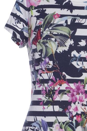 | Details | Jersey, Kurzarm, V-Ausschnitt, Reißverschluss/Knöpfe hinten, Floral, Streifen |
