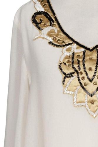 | Details | Pailletten, Stickerei, Chiffon, metallic, Langarm, V-Ausschnitt, verschlusslos, Gummizug/Tunnelzug |