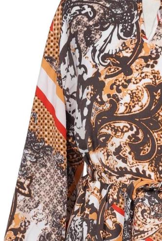 | Details | Chiffon, Dreiviertelarm, Bindegürtel, V-Ausschnitt, verschlusslos, Motivprint |