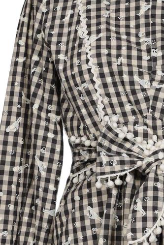 | Details | Spitze, Rüschen, Lochstickerei, Langarm, Bindegürtel, Rundhals, Kariert |