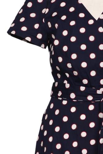 | Details | Kurzarm, Bindegürtel, V-Ausschnitt, Reißverschluss/Knöpfe hinten, Punkte |