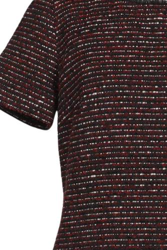 | Details | Grobstrick, Kurzarm, Rundhals, Reißverschluss/Knöpfe hinten, Hahnentritt |