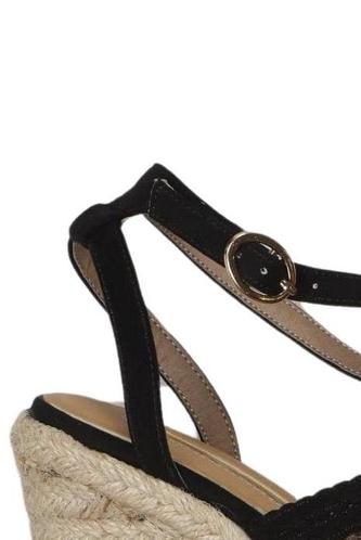 | Details | Wildlederoptik, Schnallen, Gummi, Bast |