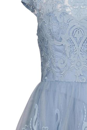| Details | Tüll, Kurzarm, Rundhals, Reißverschluss/Knöpfe hinten, Floral |