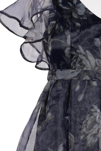 | Details | Rüschen, Chiffon, Kurzarm, Bindegürtel, V-Ausschnitt, Reißverschluss/Knöpfe hinten, Floral |