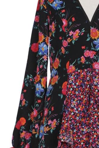 | Details | Rüschen, Chiffon, Langarm, Bindegürtel, Wickeloptik, V-Ausschnitt, Floral |