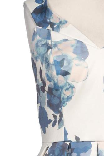 | Details | Satin, Plissee, ärmellos, V-Ausschnitt, Reißverschluss/Knöpfe hinten, Floral |