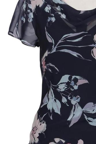 | Details | Rüschen, Chiffon, Kurzarm, V-Ausschnitt, Reißverschluss/Knöpfe hinten, Floral |