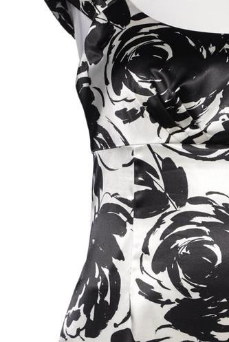 | Details | Satin, Kurzarm, V-Ausschnitt, Reißverschluss/Knöpfe hinten, Floral |