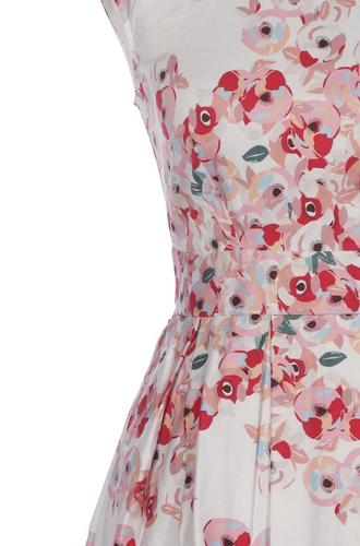 | Details | Plissee, ärmellos, Bindegürtel, Rundhals, Reißverschluss/Knöpfe hinten, Floral |