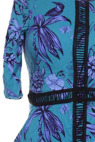 | Details | Kurzarm, Bindegürtel, Rundhals, Reißverschluss/Knöpfe hinten, Floral |