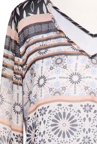 | Details | Chiffon, Langarm, V-Ausschnitt, verschlusslos, Floral, Streifen |