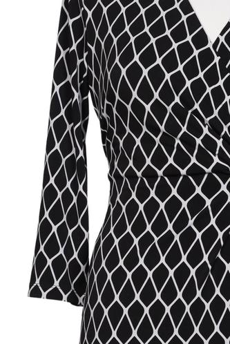 | Details | Jersey, Dreiviertelarm, Bindegürtel, Wickeloptik, V-Ausschnitt, Rauten |