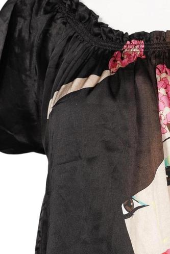 | Details | Satin, Kurzarm, V-Ausschnitt, verschlusslos, Motivprint |