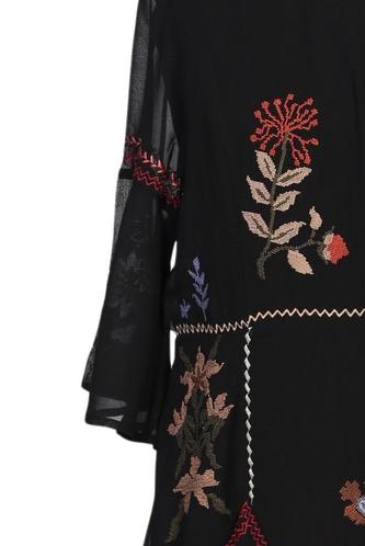 | Details | Stickerei, Chiffon, Dreiviertelarm, Rundhals, Reißverschluss/Knöpfe hinten, Floral |