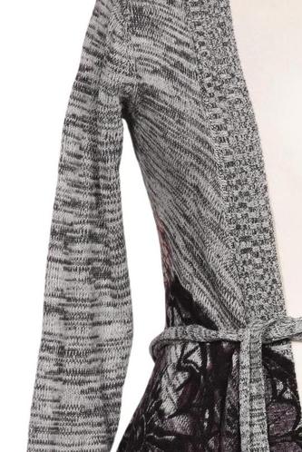 | Details | Grobstrick, Langarm, Bindegürtel, Wickeloptik, verschlusslos, Motivprint |