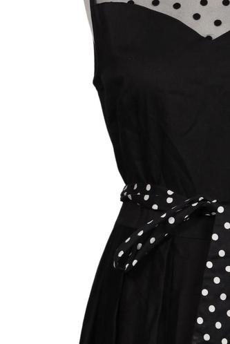 | Details | Tüll, ärmellos, Bindegürtel, Rundhals, Reißverschluss/Knöpfe hinten, Punkte |