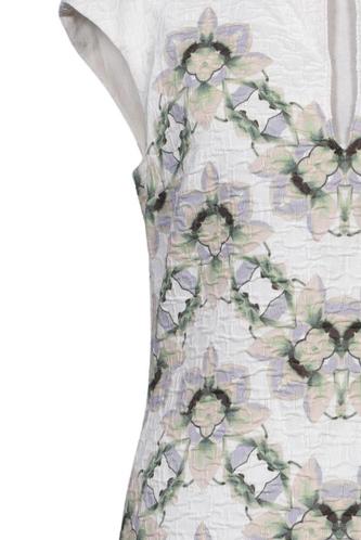 | Details | Kurzarm, V-Ausschnitt, Reißverschluss/Knöpfe hinten, Floral |