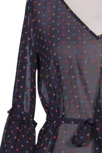 | Details | Rüschen, Chiffon, Dreiviertelarm, Bindegürtel, V-Ausschnitt, Punkte |