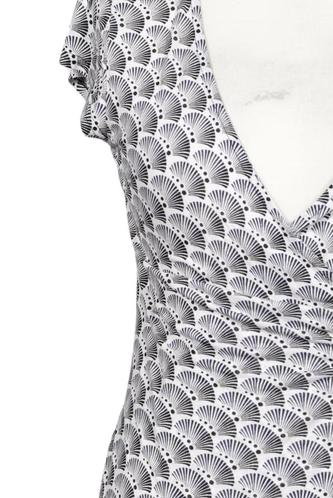 | Details | Jersey, Kurzarm, Bindegürtel, Wickeloptik, V-Ausschnitt, Motivprint |