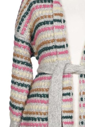 | Details | Grobstrick, Langarm, Bindegürtel, verschlusslos, Streifen |