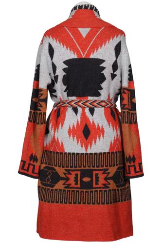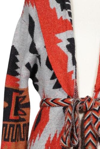 | Details | Grobstrick, Langarm, Bindegürtel, verschlusslos, Ethno |