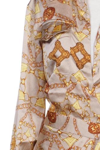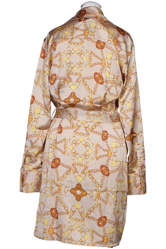 | Details | Satin, Langarm, Bindegürtel, V-Ausschnitt, Front Knopfleiste, Motivprint |
