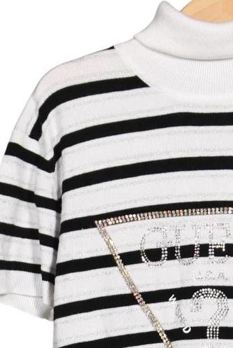 | Details | Grobstrick, Kurzarm, Rollkragen, Markenlogo, Streifen |