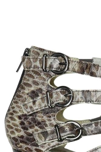 | Details | Prägeleder, Schnallen, Metall, Reißverschluss/Knöpfe hinten, Motivprint |