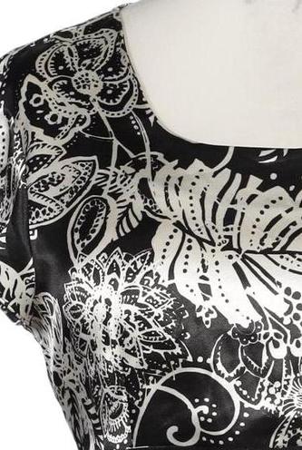 | Details | Satin, Kurzarm, Bindegürtel, Rundhals, verschlusslos, Floral, Punkte |