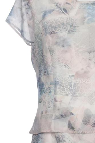 | Details | Rüschen, Chiffon, Kurzarm, Rundhals, Reißverschluss/Knöpfe hinten, Motivprint |