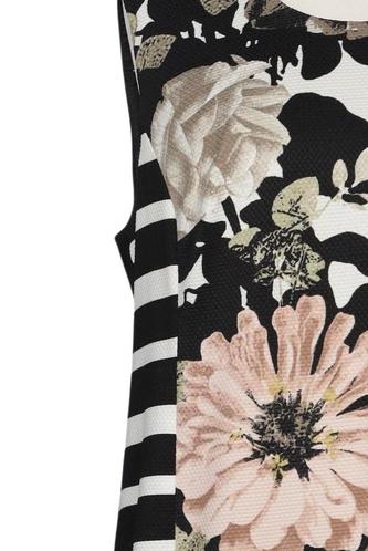 | Details | Jersey, ärmellos, Rundhals, Reißverschluss/Knöpfe hinten, Floral, Streifen |