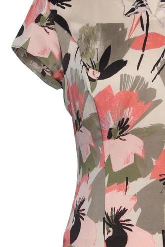| Details | Kurzarm, V-Ausschnitt, Reißverschluss/Knöpfe hinten, Floral |