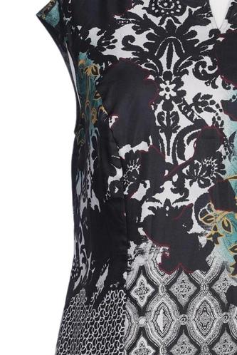 | Details | Satin, ärmellos, V-Ausschnitt, Reißverschluss/Knöpfe hinten, Ethno, Floral |