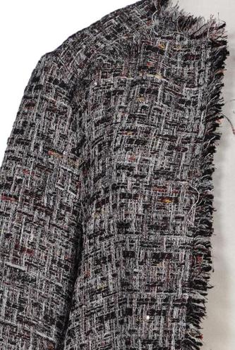 | Details | Fransen, Grobstrick, Langarm, Rundhals, Front Knopfleiste, Hahnentritt |