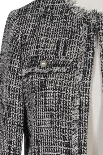 | Details | Fransen, Grobstrick, Langarm, Rundhals, Front Knopfleiste, Hahnentritt |