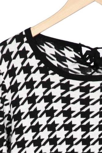 | Details | Grobstrick, Langarm, Rundhals, Hahnentritt |