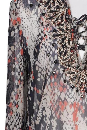 | Details | Stickerei, Chiffon, Langarm, V-Ausschnitt, verschlusslos, Motivprint |