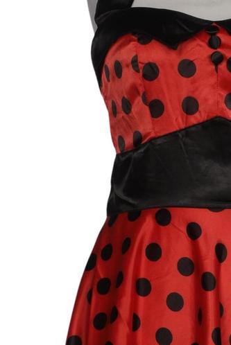 | Details | Satin, ärmellos, Bindegürtel, V-Ausschnitt, Reißverschluss/Knöpfe hinten, Punkte |