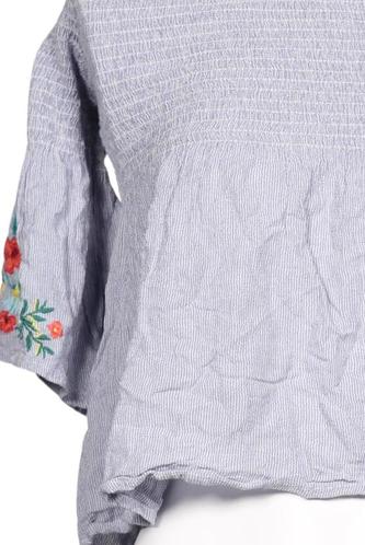 | Details | Jersey, Stickerei, Kurzarm, V-Ausschnitt, verschlusslos, Floral |