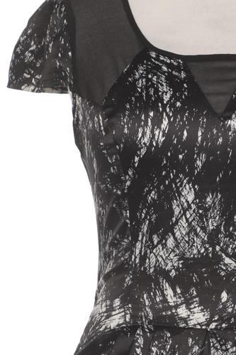 | Details | Satin, Rüschen, Kurzarm, V-Ausschnitt, Reißverschluss/Knöpfe hinten, Motivprint |